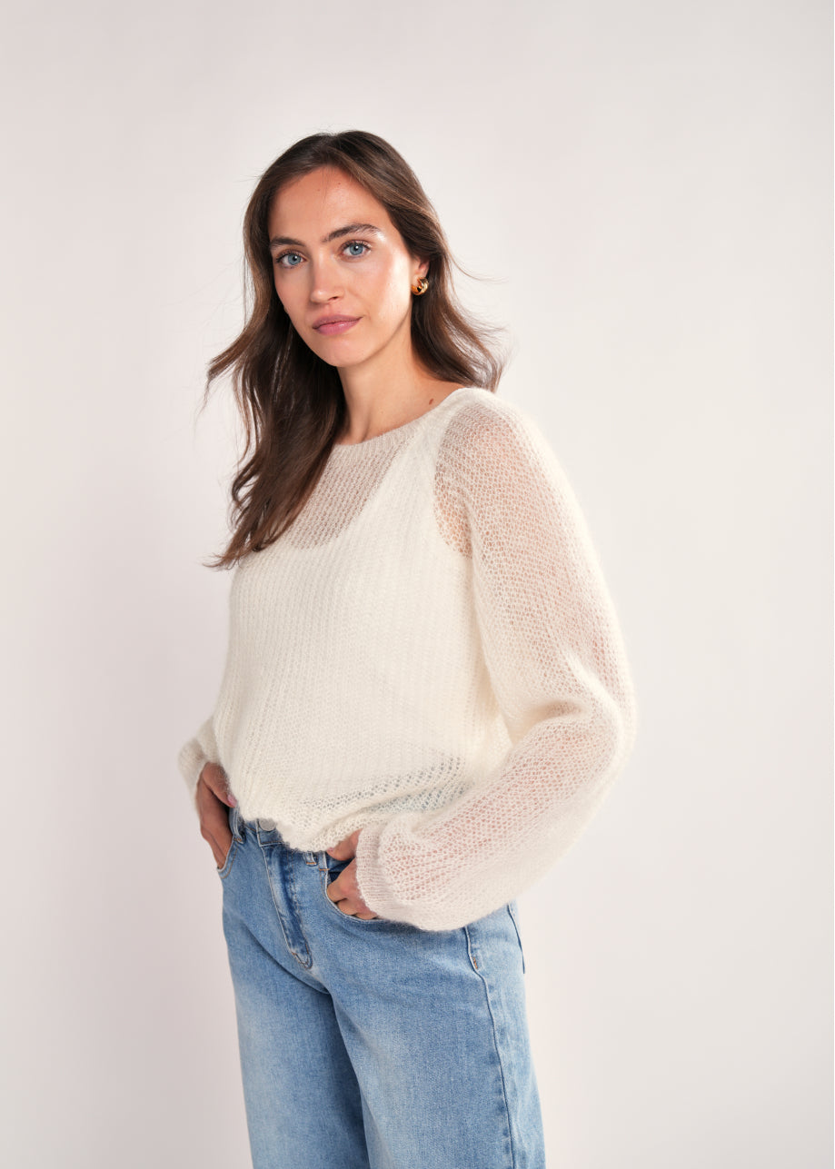 Deze gebreide trui is uitgevoerd in een open knit mohair blend met een luchtige en zachte uitstraling. De combinatie van mohair en wol zorgt voor warmte, terwijl de open structuur het ontwerp licht en comfortabel houdt. De regular fit en ronde hals maken deze trui tijdloos en veelzijdig, perfect om los te dragen of te layeren.