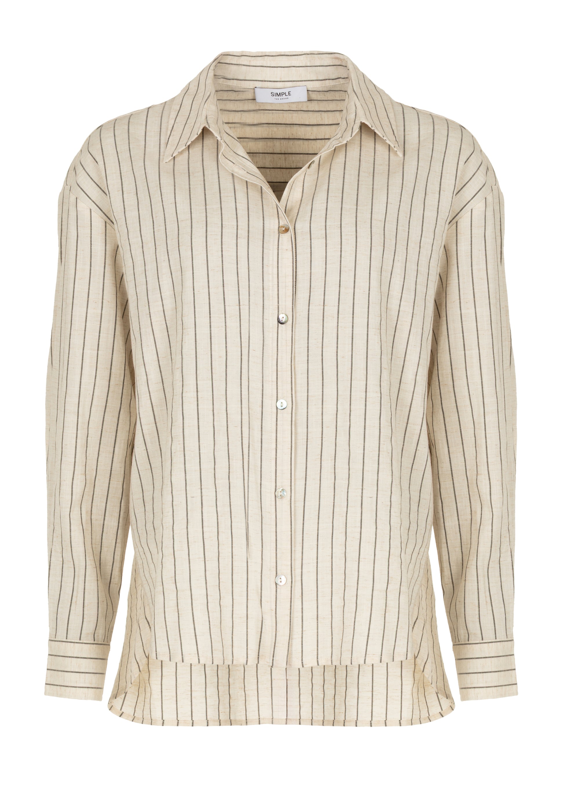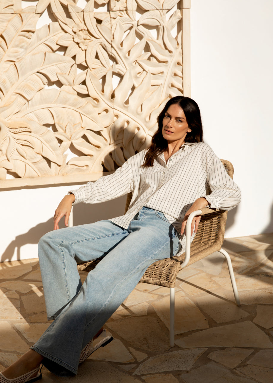 Deze blouse is gemaakt van een luchtige viscose-linnenblend met een subtiele streepstructuur. De stof voelt zacht en natuurlijk aan en is perfect voor warmere dagen. De licht oversized pasvorm zorgt voor een ontspannen silhouet, terwijl het plooi-detail aan de achterzijde extra bewegingsvrijheid en een verfijnde afwerking toevoegt. Een tijdloos item dat moeiteloos casual en gekleed te dragen is.