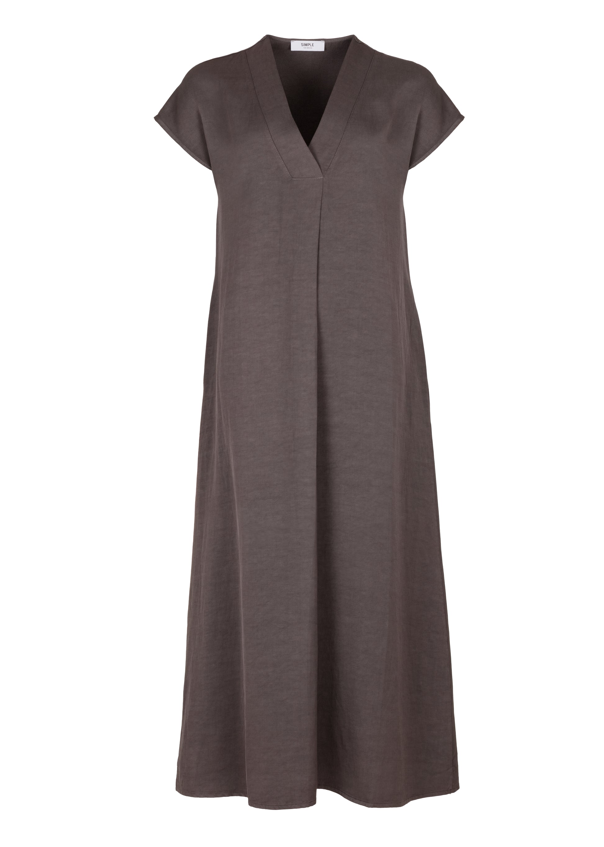 Deze lange jurk is uitgevoerd in een verfijnde blend van viscose, linnen en Tencel met een subtiele glans in de stof. De diepe V-hals en korte mouwen geven het ontwerp een elegante, moderne uitstraling, terwijl de vloeiende belijning zorgt voor een ontspannen en vrouwelijk silhouet. Een tijdloos item dat zowel casual als gekleed gedragen kan worden.