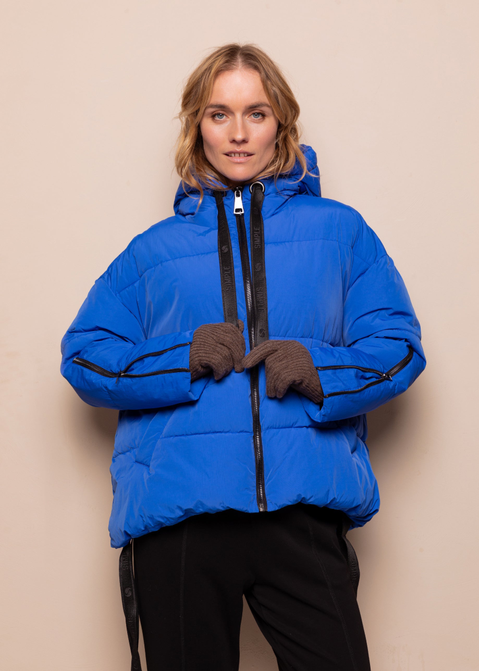 - Blauwe jas met lange mouwen en een ritsluiting.