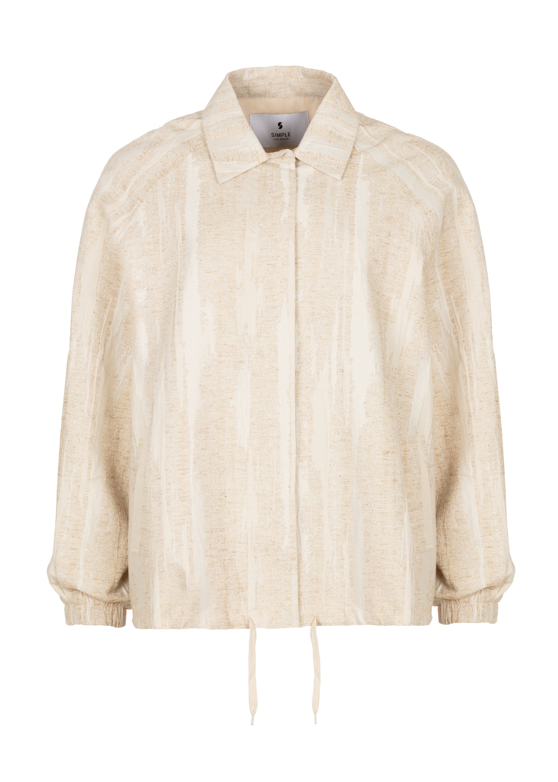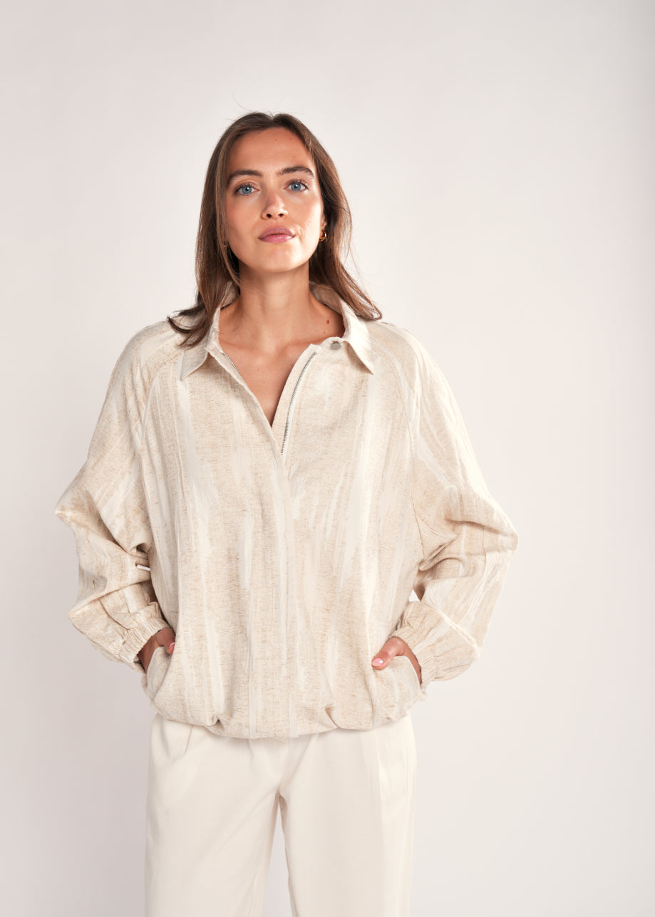 Deze oversized blouse-jas is gemaakt van een jacquardstof met een natuurlijke uitstraling en een subtiele structuur. Het ontwerp combineert het comfort van een blouse met de nonchalante look van een licht jasje. De losse pasvorm zorgt voor een moeiteloos silhouet, terwijl de kraag en lange mouwen het geheel een verfijnde afwerking geven. Ideaal als stijlvolle laag over een top of jurk.