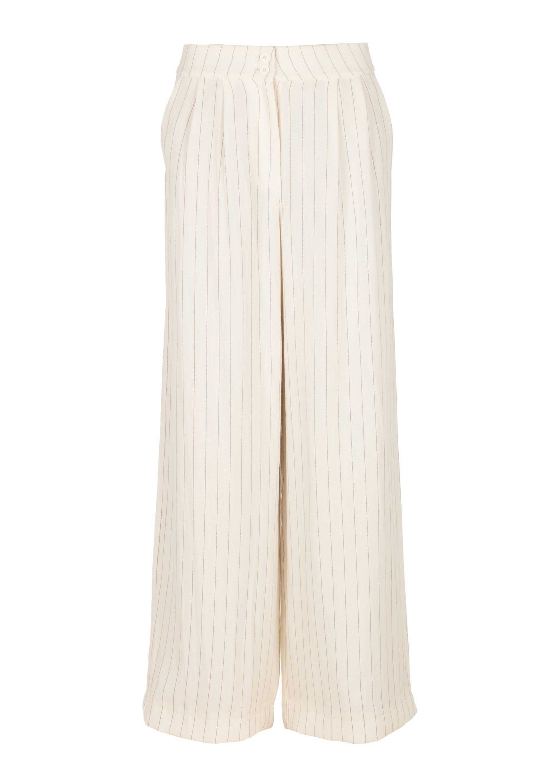 These elegant trousers are crafted from a viscose-linen blend featuring a refined pinstripe pattern. The fabric has a subtle texture and a light, airy feel, making them comfortable to wear throughout the day. The wide-leg silhouette creates a flowing, sophisticated look, while the pleats at the front waistband enhance the shape and add a tailored touch. A timeless piece that effortlessly combines comfort and elegance.