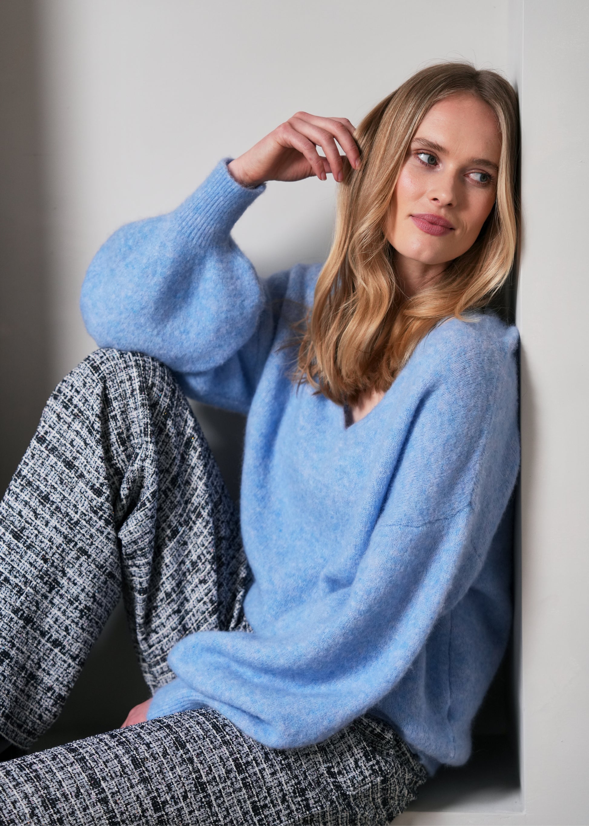 This knitted sweater is a subtle statement piece that effortlessly combines warmth and style. Crafted from a luxurious blend of wool, polyamide, and wool-viscose with a hint of stretch, it offers a comfortable fit and a soft hand feel. The deep V-neckline and slightly ballooned sleeves create a modern, feminine silhouette that's perfect for everyday wear.
