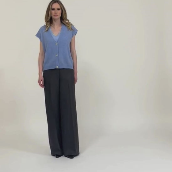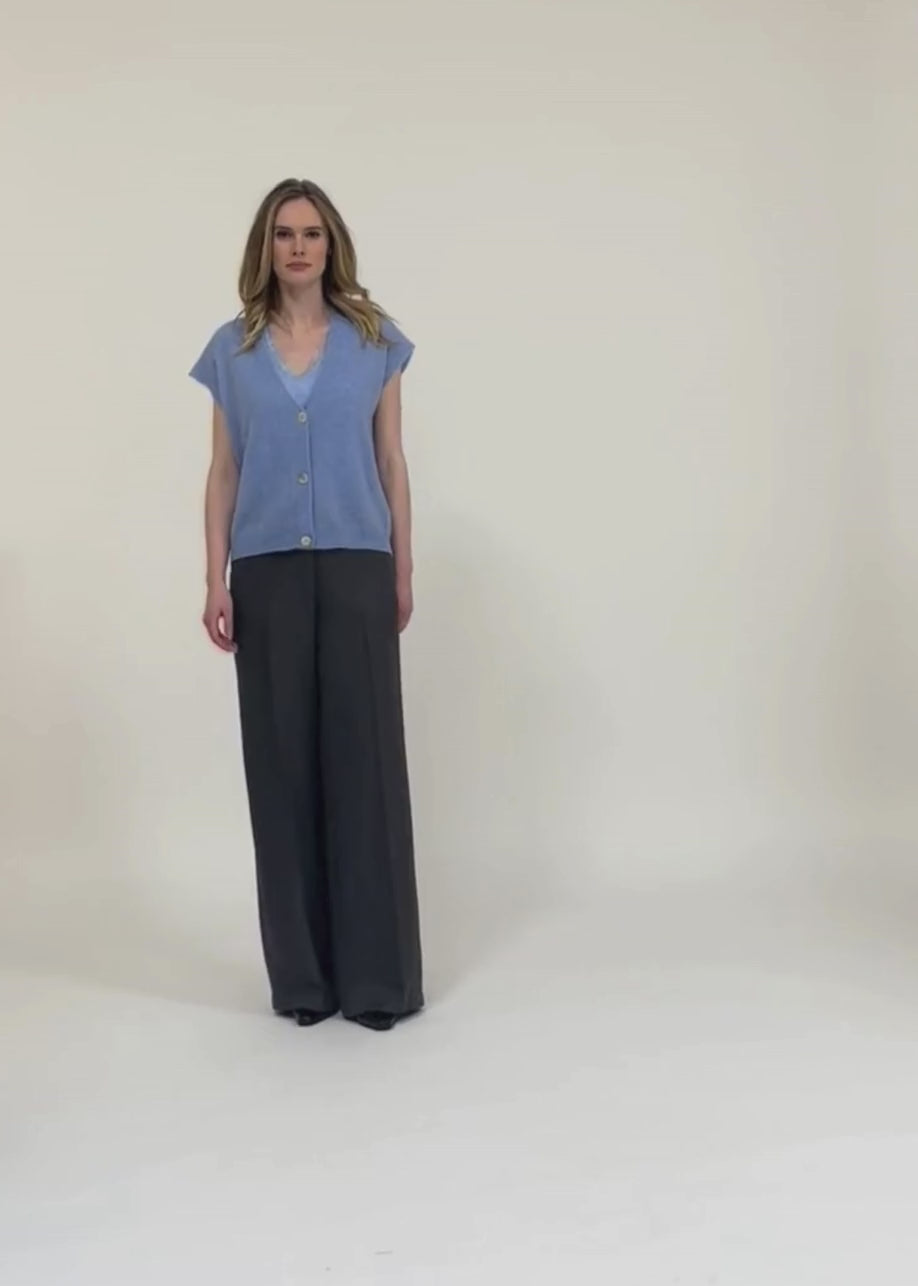 The Seppa gilet is an elegant wide-fit spencer with a button closure — perfect for layering over a blouse or dress. Crafted from a soft and warm wool blend, it offers a comfortable fit and a modern, relaxed silhouette. The deep V-neckline and refined finish lend a subtle feminine touch.